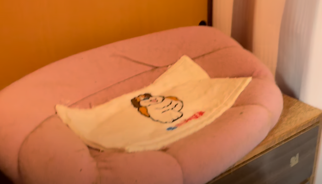 ⑤⑥⑦ヒーター前の床にある3つの猫ベッド