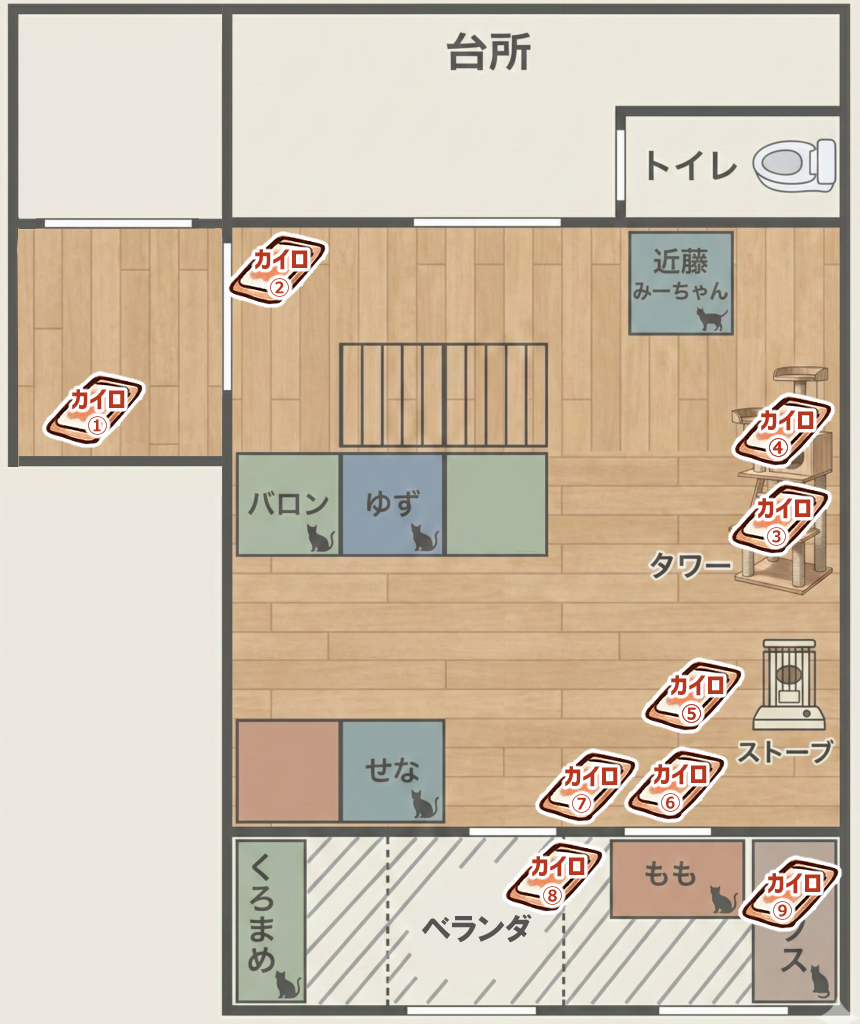 (※猫により入れる場所、個数が異なります) - 朝当番さんが置いてくれたケージ外カイロをベランダへセット